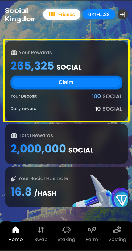 The automatic mining process in Social Kingdom directly values users' social media activities and converts them into SOCIAL tokens.